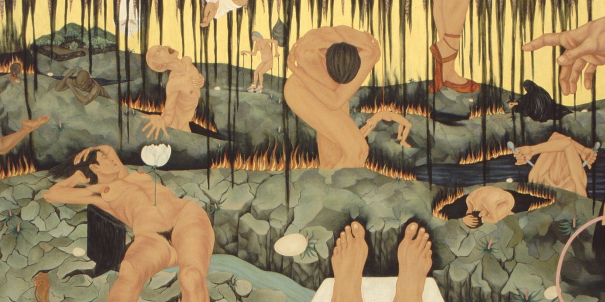 Second, if we pursue the structural aspects of language, what constitutes a vocabulary and a syntax within the context of the body’s capacity for communication? Are there gestures and postures, expressions and movements that may be generally understood? In this context, we may consider how representations of the body serve to mediate between private and public spheres, between personal and universal. On occasion, Hess may serve as her own model (most notably in her recent work Living Water), use references pertinent to the study of life drawing, or employ representations of non-western disciplines such as yogic practice, as in the enigmatic and meditative Temple, a work unique in the way in which it isolates the singular body. In contrast, the panoramic Body Conscious/Back to the Garden is laden with multiple, sometimes androgynous bodies and fragments, from the pointing hand of God at the right, to a figure emerging from the earth at left, each of which must be separately considered as part of an extended process of interpretation.