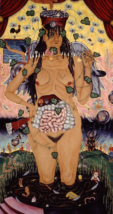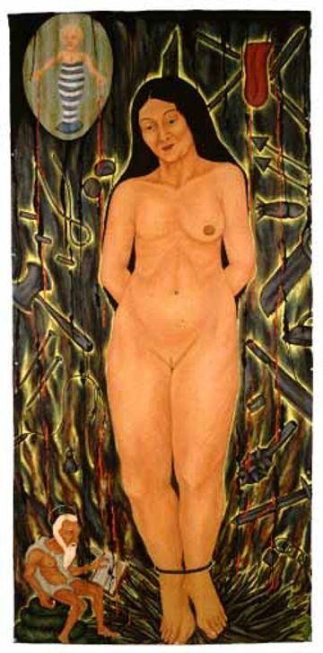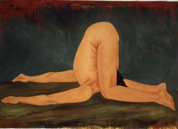 Having a large studio to work in allowed me to expand my vision in physical ways. There is a relationship between my work on the body and how you physically perceive it. Size is another tool an artist can use for effect and communication. Most paintings here are on unstretched canvas hung by velcro and rolled for storage, but a few are triptychs on stretched canvases. Prices are on demand as the condition of each needs to be individually assessed.