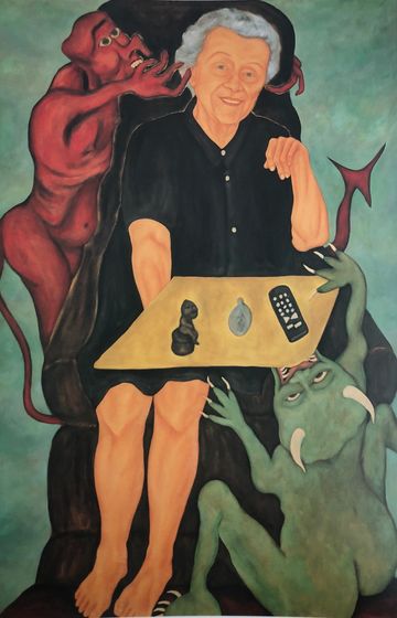 I loved my grandmother. My lingering memories are of her sitting watching television, set in her ways in old age. I've tried to express This behavior/beliefs as protective talismen against her personal devils.