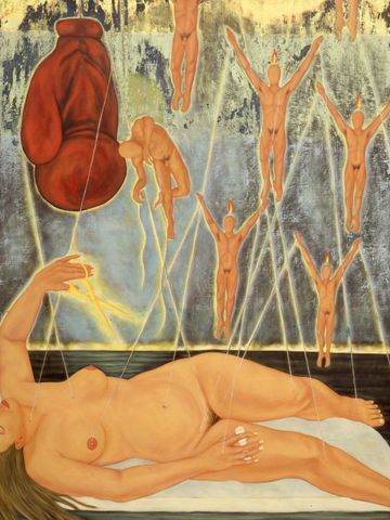A contemplation on the value and cost of men in a woman's life, the protagonist has a vibrator in one hand as she cuts the strings of myriad men energetically tied to her, her way of fighting back to determine happiness on her own terms.