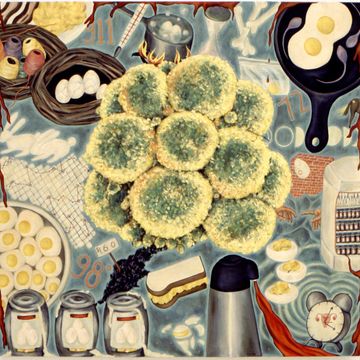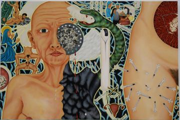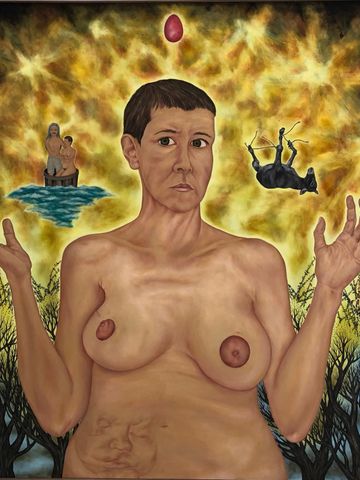 In this painting the bathtub is a metaphor for our physical bodies. This work is about how we can overcome our physical limitations and that of our physical existence to connect with and return to our spiritual state. The baby represents our innocence and lack of power on the physical plane, the passion flowers an indication to follow our passion as well as reference the spiritual.