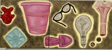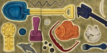 A predecessor painting to Civilized (Two Landscapes), Ayer's Rock Pudding was inspired by a trip to a Sydney bakery where an English Style pudding was a ringer for the famous landscape. Here presented with cloying sweetness by a perhaps overly friendly westerner, other desserts for sale might also resemble ancient Australian landscapes.